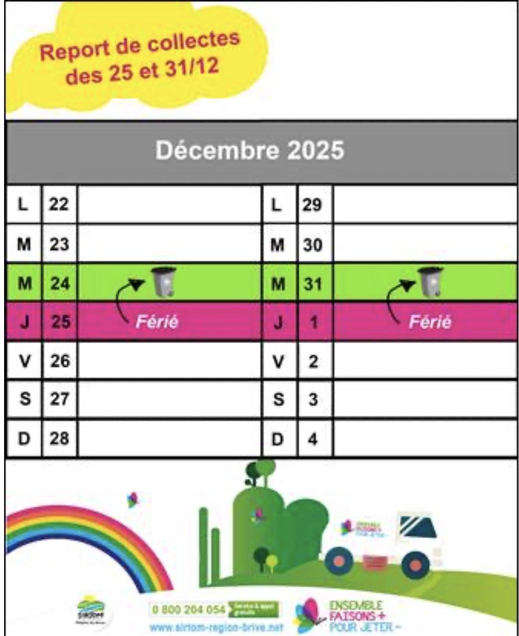 - Celles des JEUDI 25 DÉCEMBRE ET 1er JANVIER 2025 - jours fériés, SONT AVANCÉES AUX MERCREDI 24 ET 31 DÉCEMBRE.