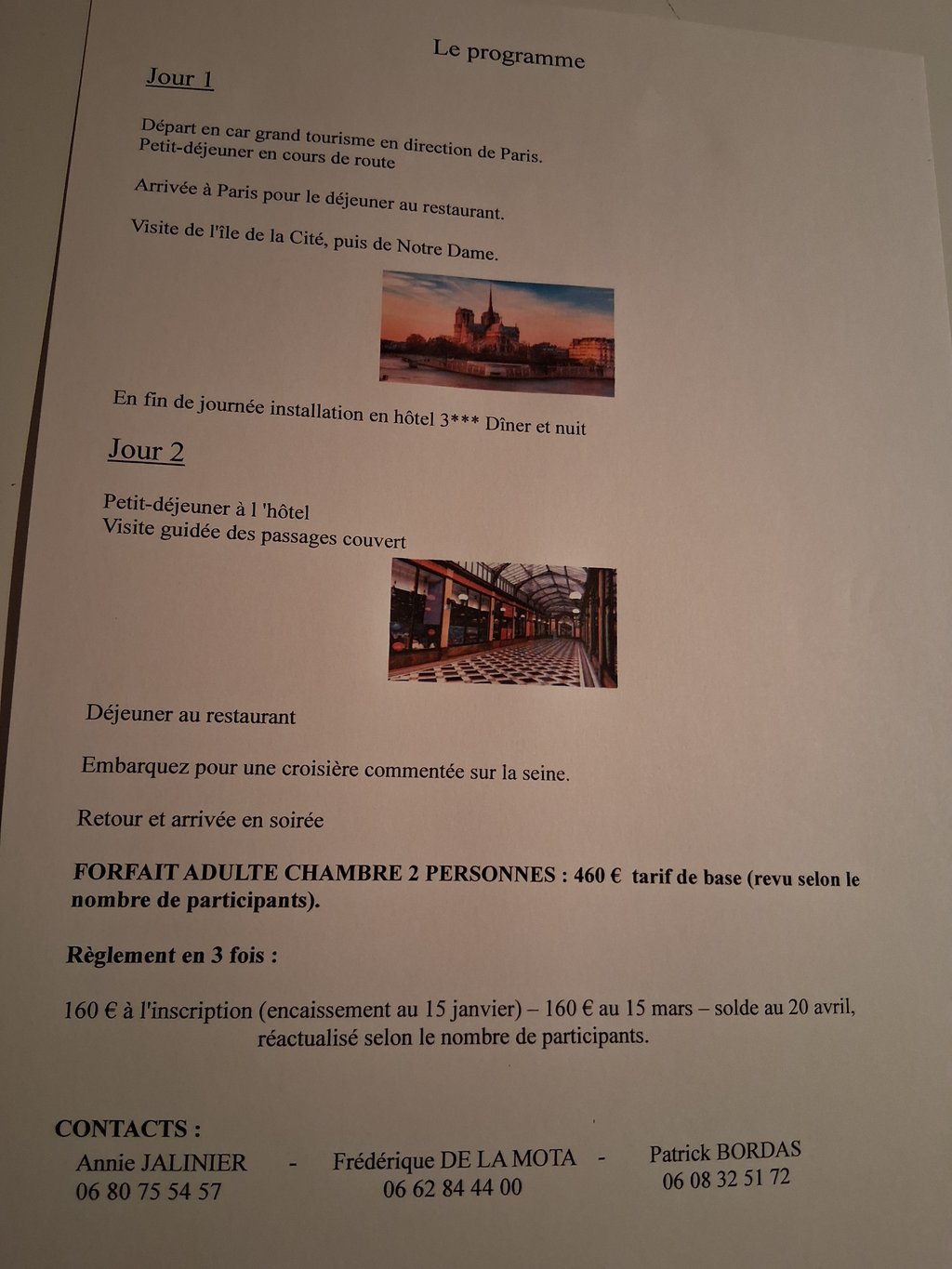 Sourire d'automne de Voutezac, organise une sortie sur deux jours à Paris, avec entre autre la visite de Notre Dame, une promenade en bateaux mouche et la découverte des passages couverts.