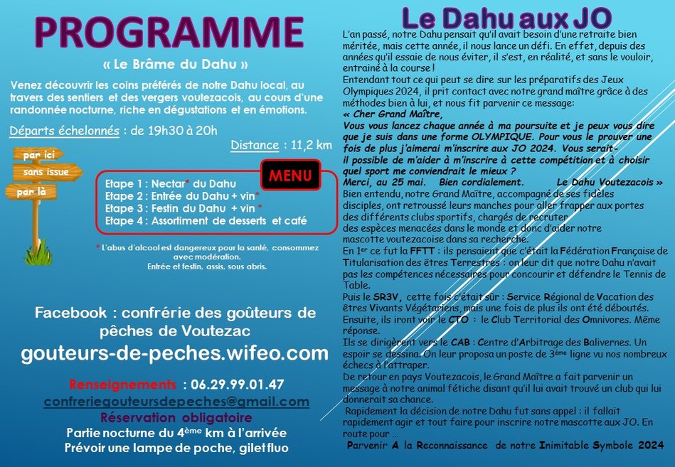 - Venez découvrir les coins préférés de notre Dahu local, au travers des sentiers et des vergers Voutezacois, au cours d'une randonnée nocturne, riche en dégustations et en émotions.