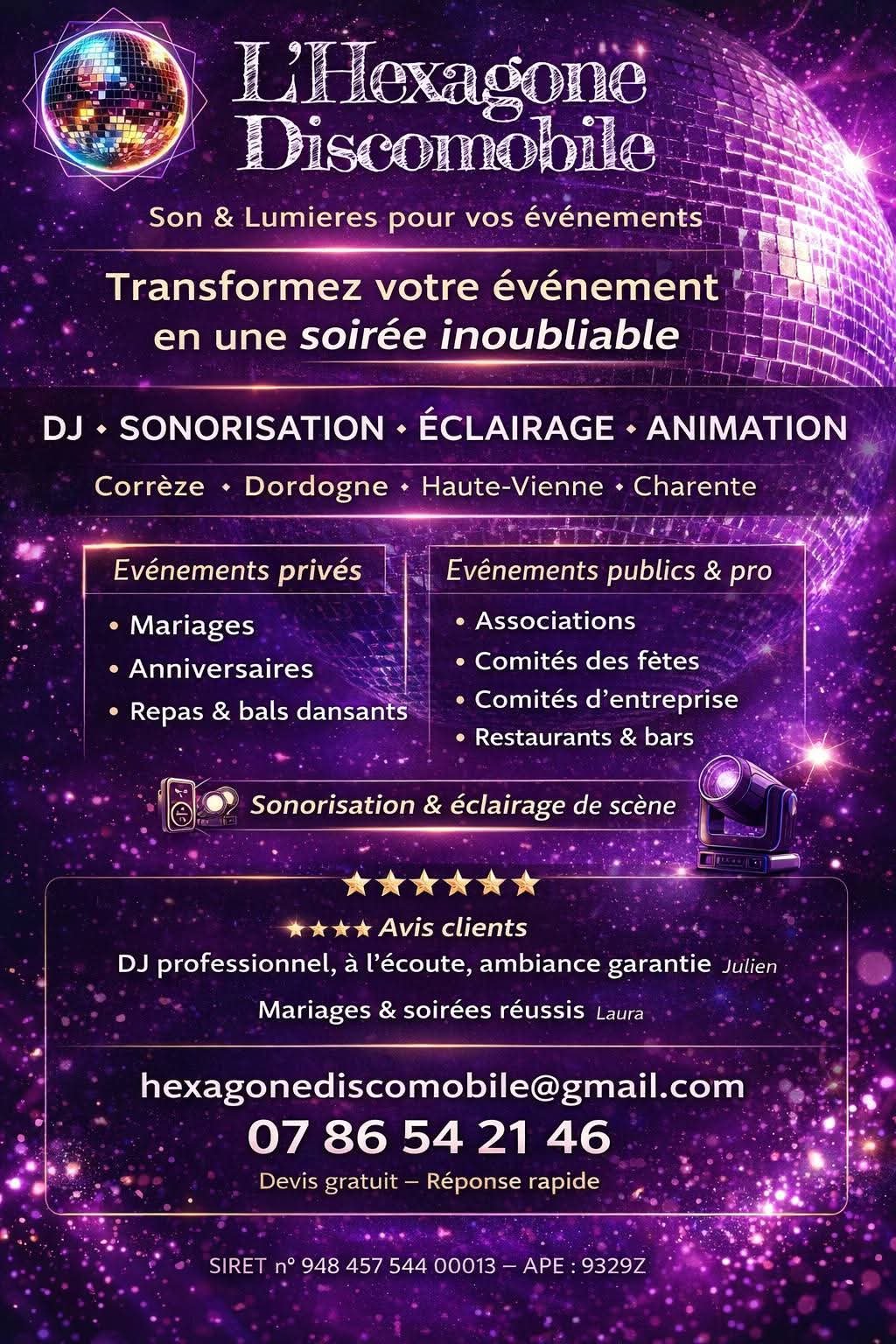 Disco-mobile depuis plusieurs années dans l'animation de soirées et d'évènements, forts de notre savoir-faire, nous intervenons sur vos Mariages, Anniversaires, Bals et Repas dansant… Nous intervenons également sur vos sonorisation & Éclairage de scène (Galas, Théâtre…). Évènements public ou privé, auprès des particuliers, associations, pro, comités des fêtes, comités d'entreprise…
